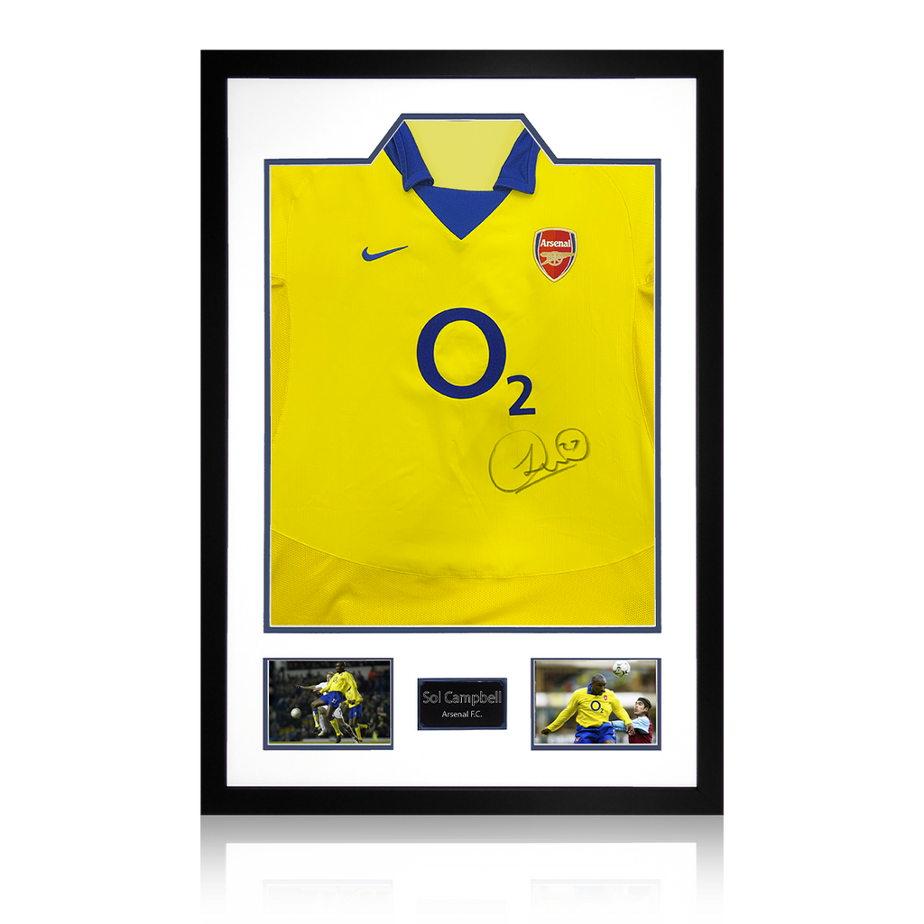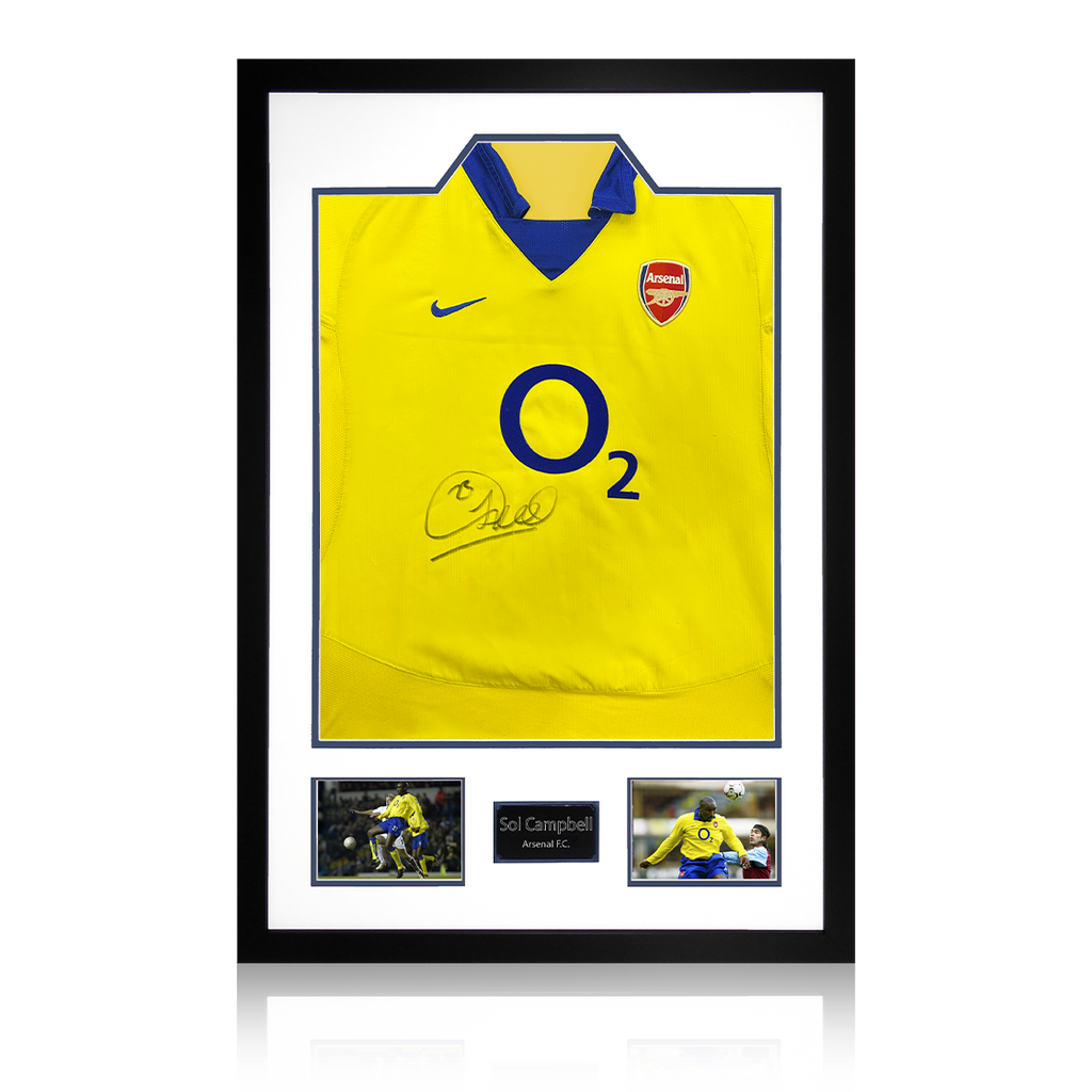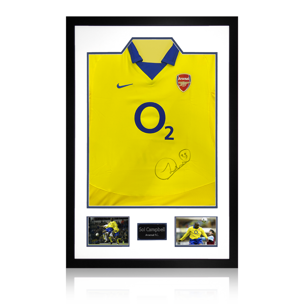 A signed authentic Arsenal 2003-05 away shirt by Sol Campbell in a Premium Frame. The item was signed at a private signing on the 06/03/25. This item is accompanied with an certificate of authenticity from The Fan C...