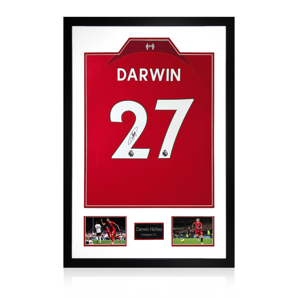 This wooden framed presentation contains a custom plaque 2 photos and a Liverpool club shirt signed by Uruguayan striker; Darwin Núñez.