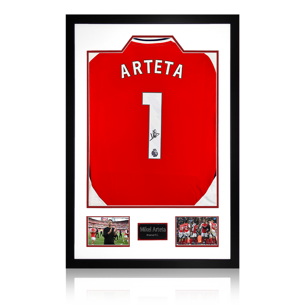 Beautifully presented Premium Frame with signed Arsenal shirt from Mikel Arteta. This item measures approximately 690mm x 480mm. This item is accompanied with an certificate of authenticity from The Fan Cave.