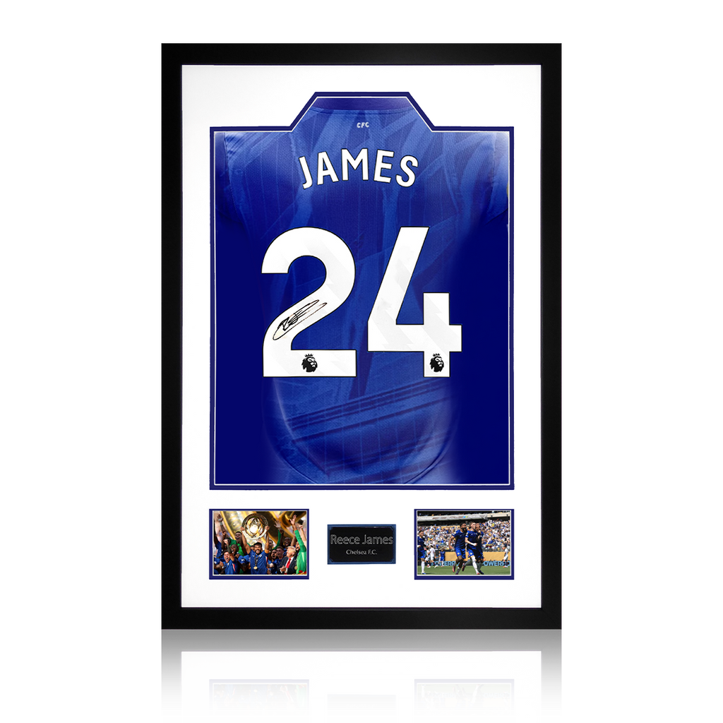 Beautifully presented Premium Frame with signed Chelsea shirt by Reece James. The frame measures approximately 850mm x 600mm. This item is accompanied with an certificate of authenticity from The Fan Cave & third party auth...