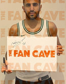 2 photo signed shirt display by Riyad Mahrez. He made is Algeria debut on 31/05/14 when he started against Armenia in a 3-1 Victory. He also captained his country to a Africa Cup of Nations win in 2019 where they defeated Senegal 1-0 in the final.