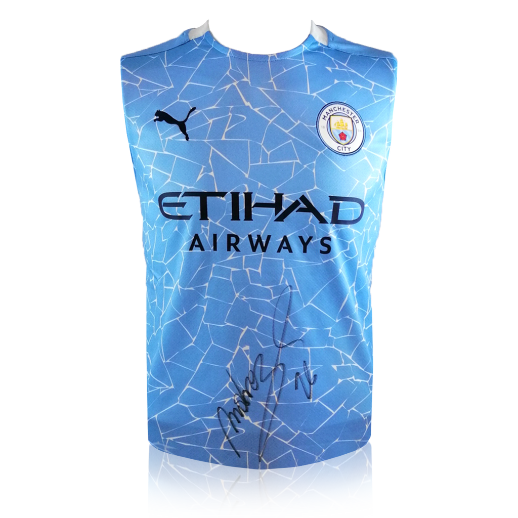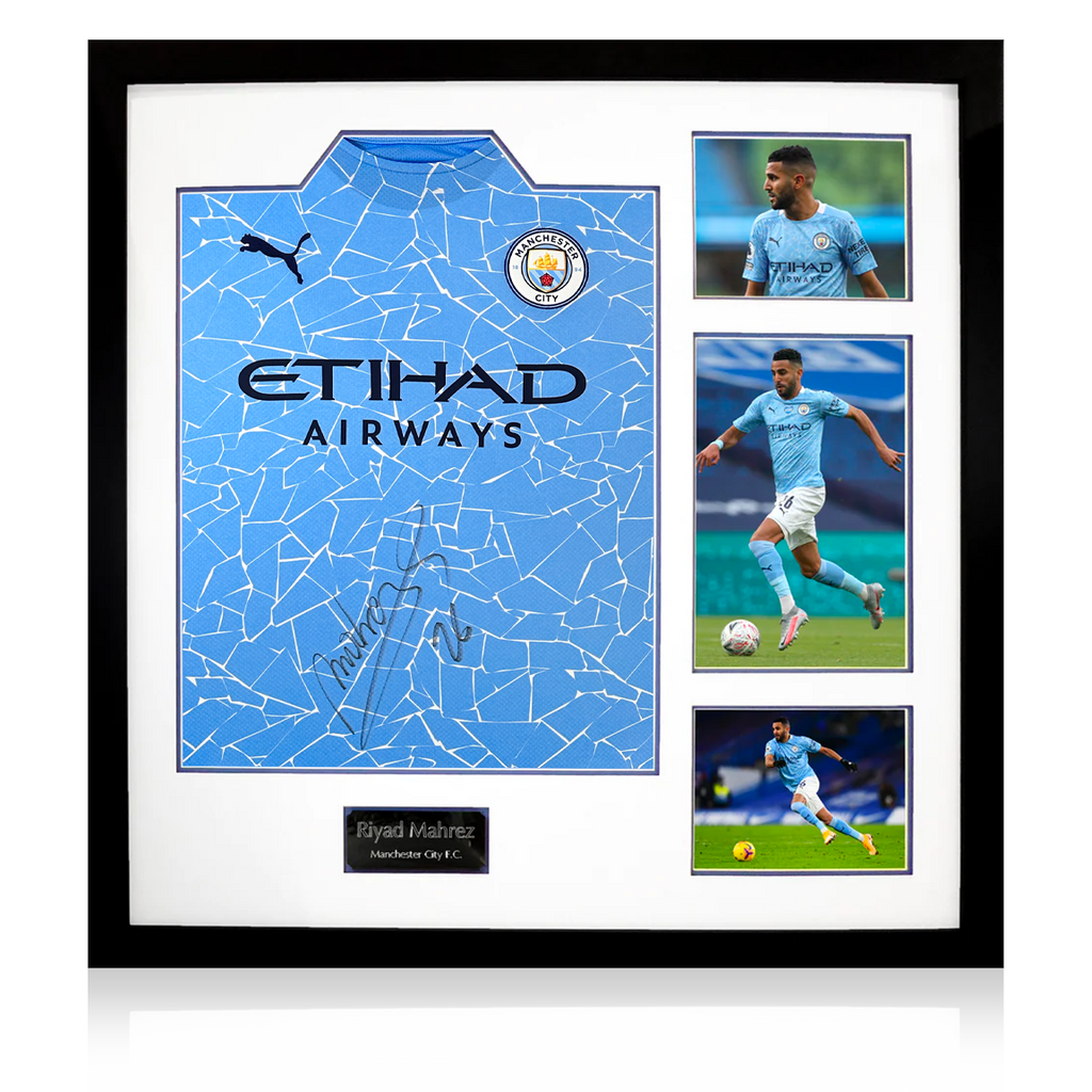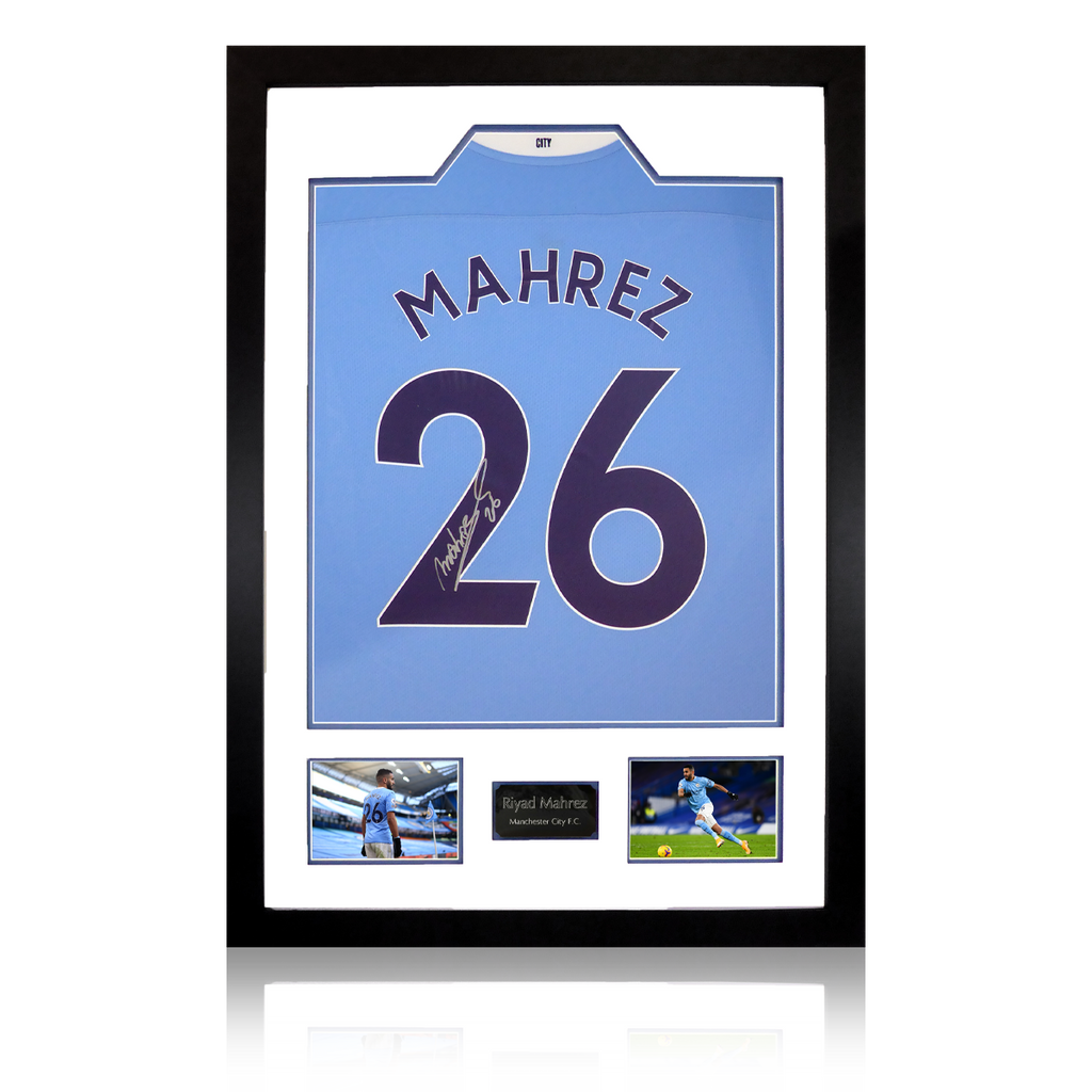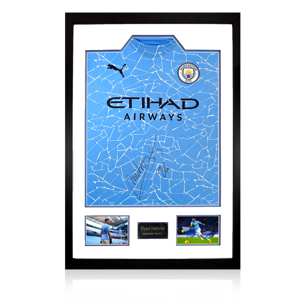 A Manchester City signed shirt by Riyad Mahrez. So far in his Manchester City career his has won 9 trophies with the club which include 3 Premier League titles, 1 FA Cup, 2 Community Shields and 3 League Cups in a row.