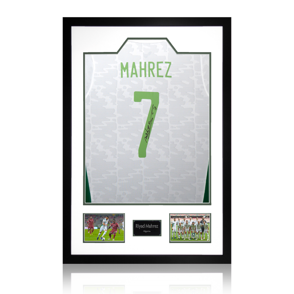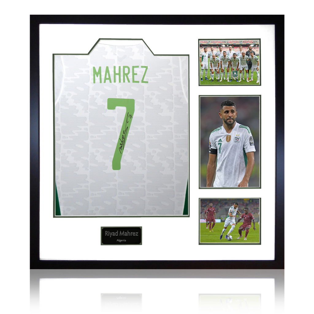 3 photo Algeria shirt display in a wooden frame signed by Manchester City star; Riyad Mahrez.