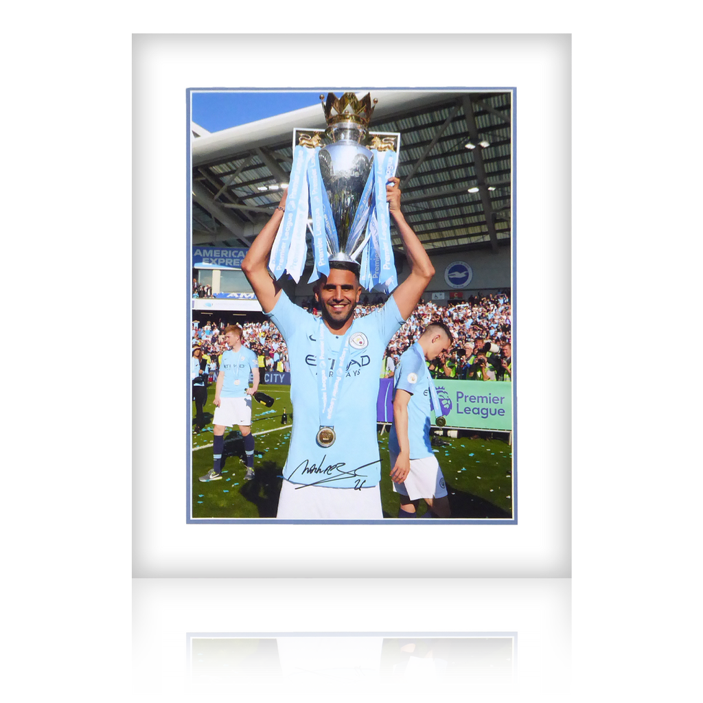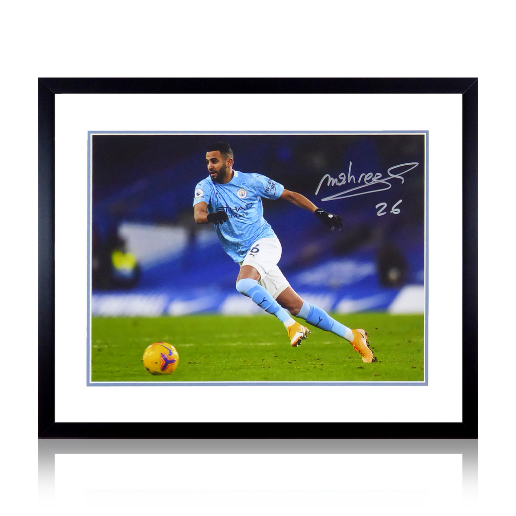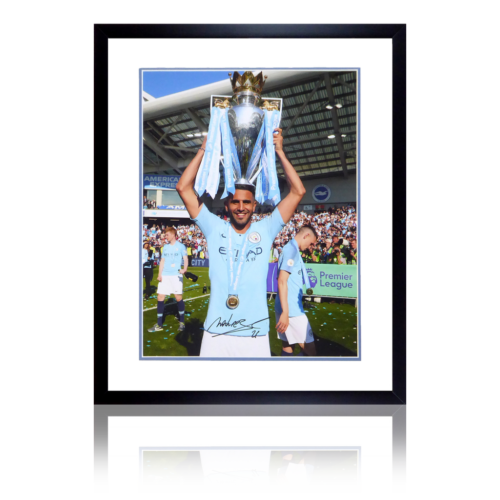 A signed mounted photo in a frame by Riyad Mahrez. So far in his Manchester City career his has won 9 trophies with the club which include 3 Premier League titles, 1 FA Cup, 2 Community Shields and 3 League Cups in a row.