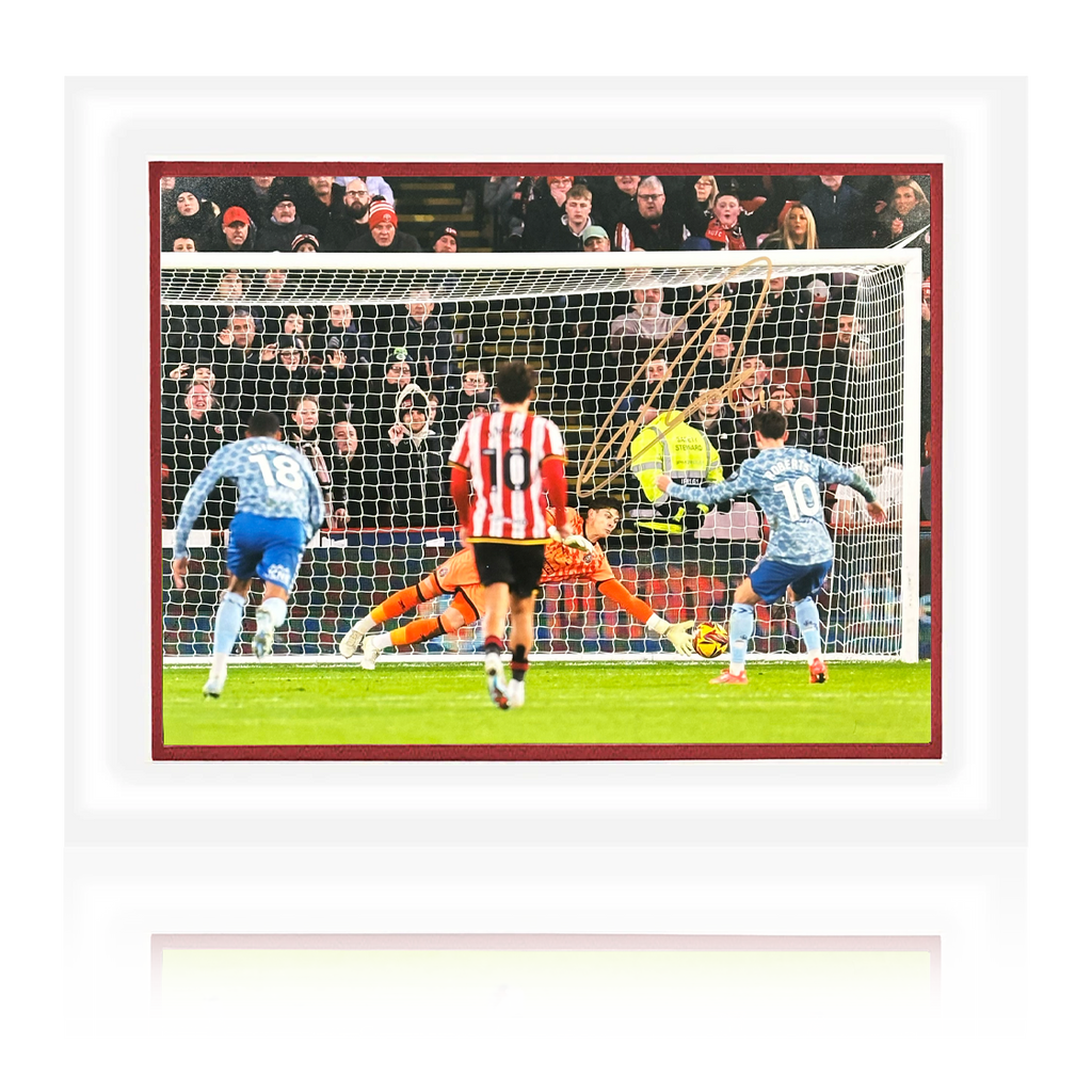 Signed mounted photo of SUFC midfielder Ollie Arblaster. These mounts are designed to fit an off the shelf size frame and make a great addition to any collection. Signed as part of a private signing with The Fan Cave in 2024!