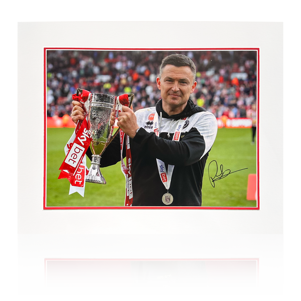 Signed mounted photo of SUFC Manager Paul Heckingbottom. These mounts are designed to fit an off the shelf size frame and make a great addition to any collection. Signed as part of a private signing with The Fan Cave in 2023!