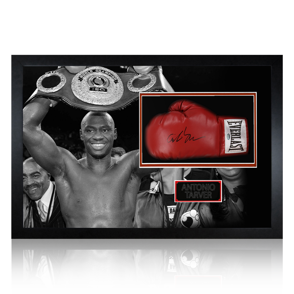 Antonio Tarver boxing glove in a real wood frame with custom box rear to allow the front acrylic to be flat. The glove is full size and has been signed by Antonio Tarver. The autograph includes an official Schwartz Sports H...