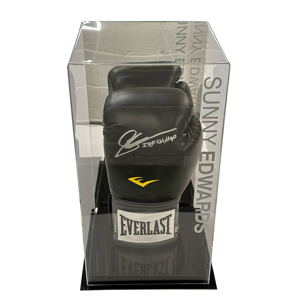 A 10oz black Everlast glove signed by "Showtime" Sunny Edwards. Sunny is a former IBF World Champion which he held from April 2021 to December 2023. Signed at a private signing with former IBF world champion Sunny Edwards, exc...
