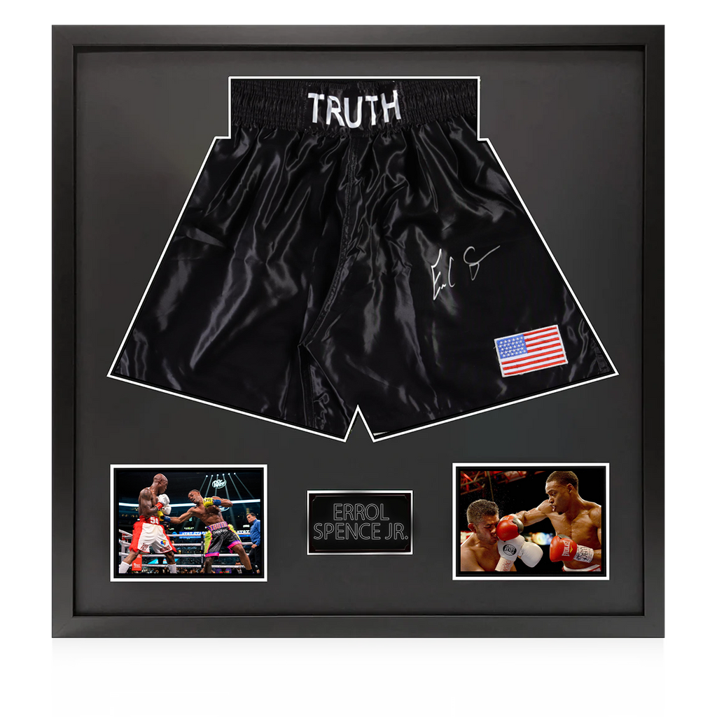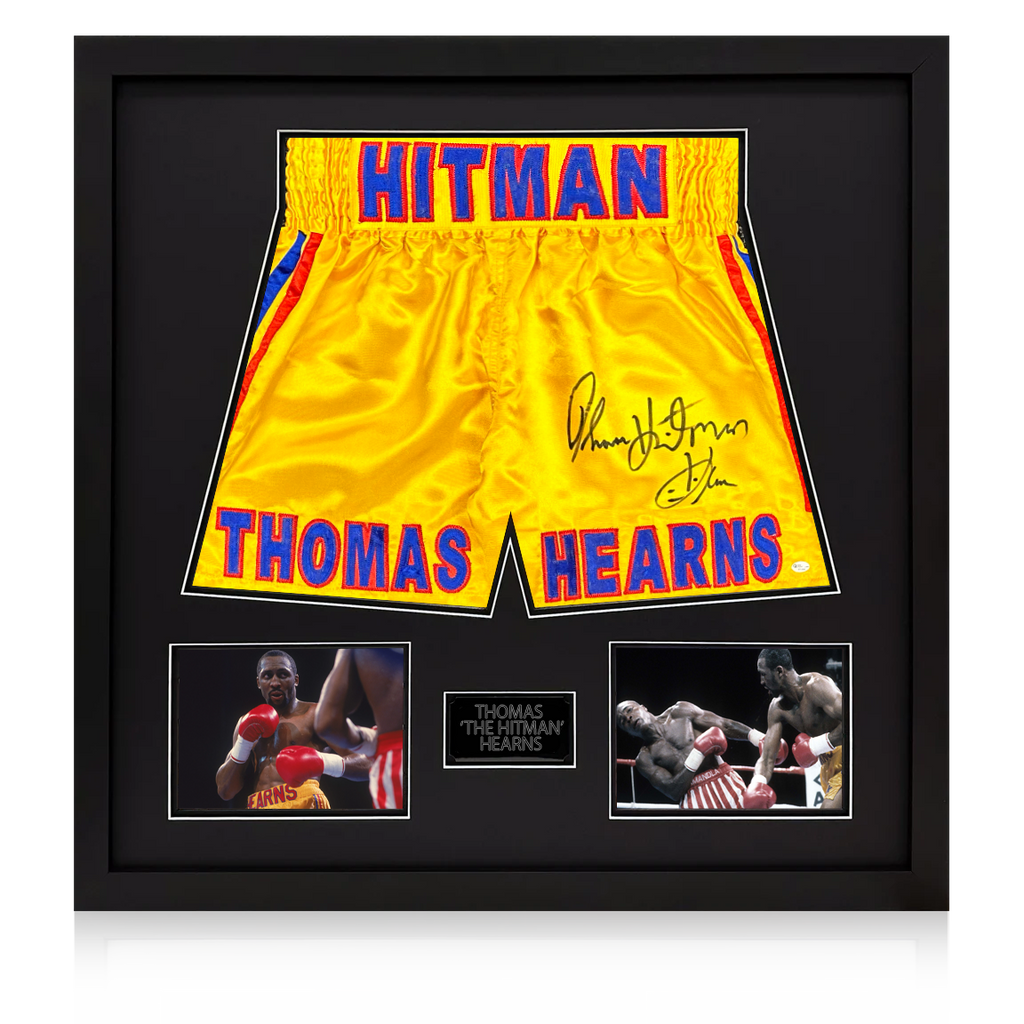 Framed display containing a pair of boxing shorts signed by Thomas 'Hitman' Hearns.