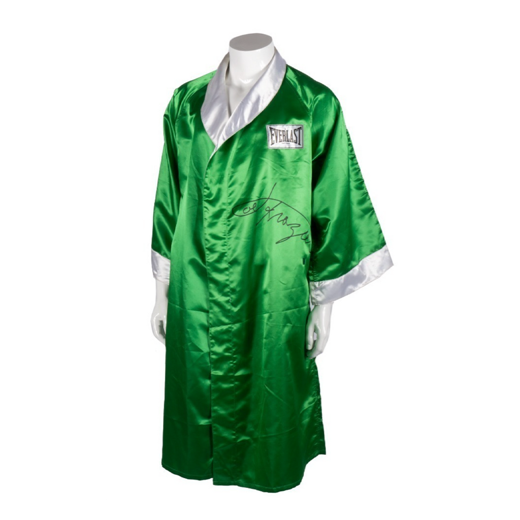 A green Everlast brand boxing robe signed by former undisputed heavyweight champion of the world Joe Frazier. The green satin robe features white satin lapels, with Everlast manufacturer's patches stitched into the left chest, ...