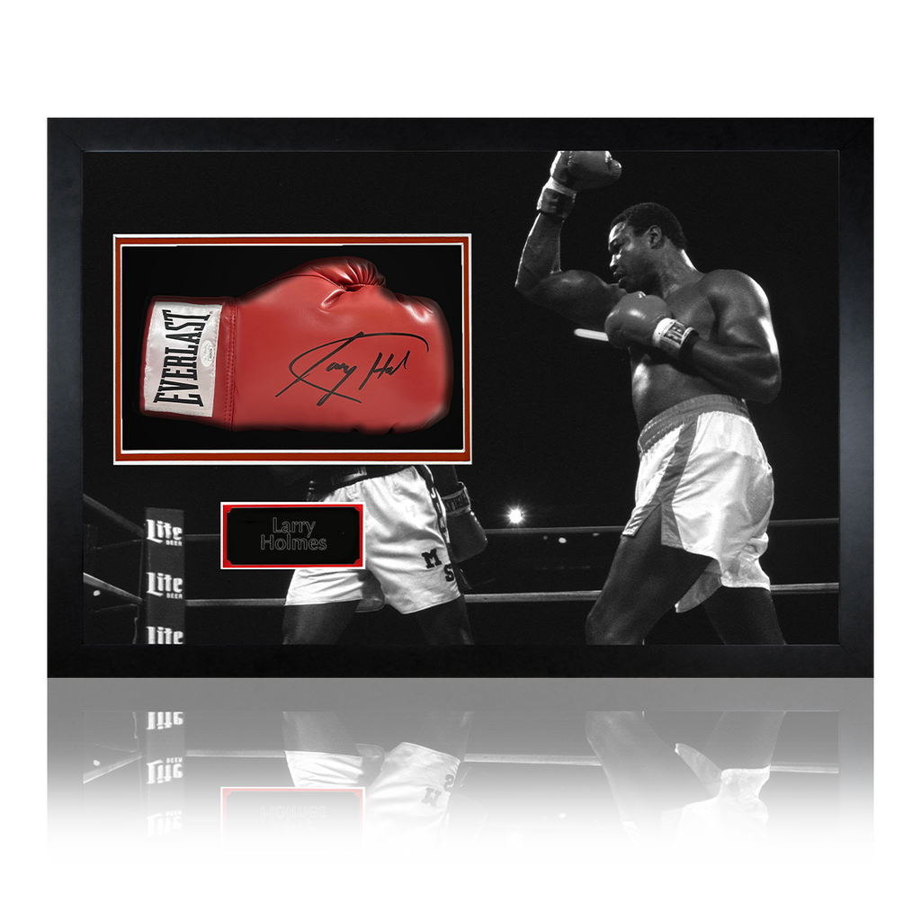 Poster mount display in a wooden frame with plaque, containing an Everlast boxing glove signed by "The Easton Assassin" Larry Holmes An icon of the sport, Larry Holmes defeated legends such as Earnie Shavers, Ken Norton an...
