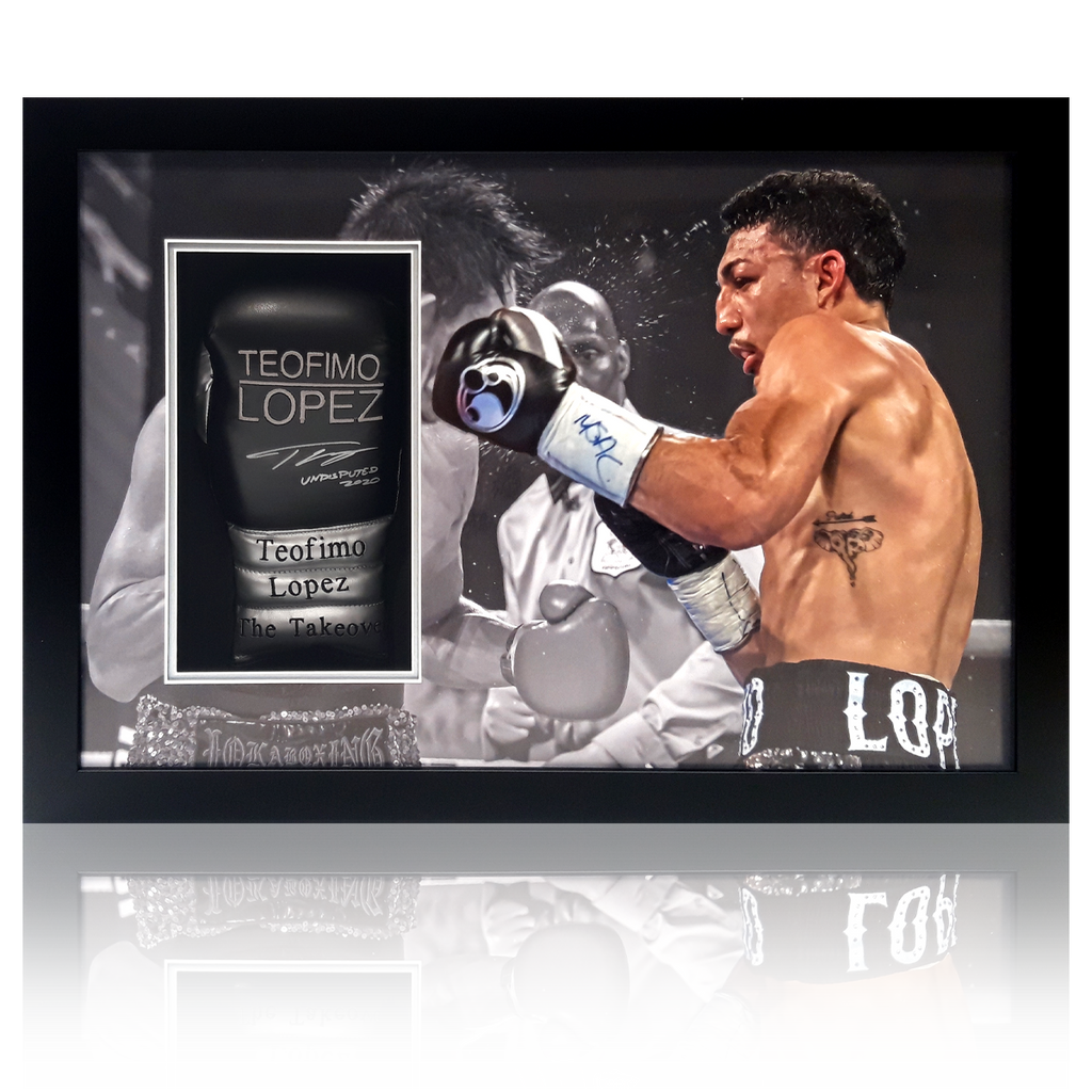 Framed poster mount signed glove display by Teofimo Lopez. "The Takeover" has had 20 fights with a record of 19 wins and  1 loss With 13 of those victories ending in a KO.