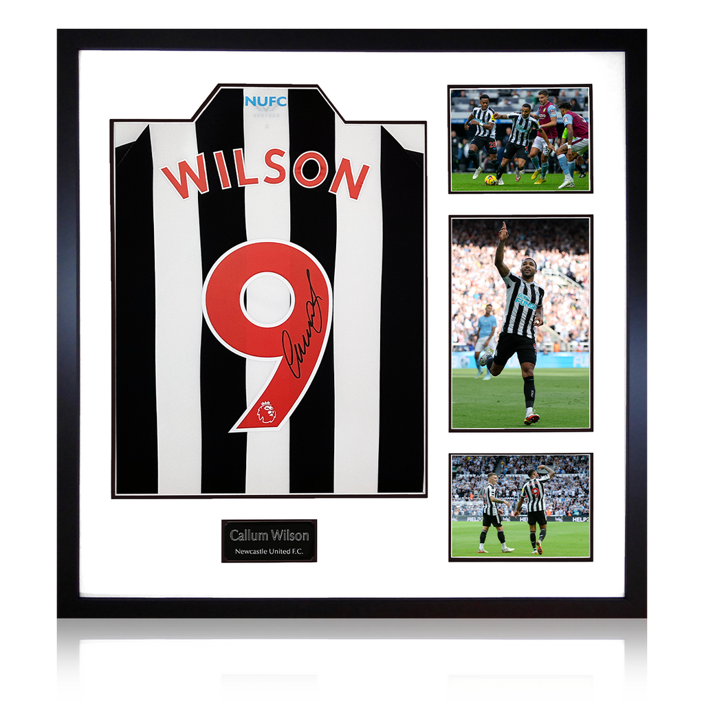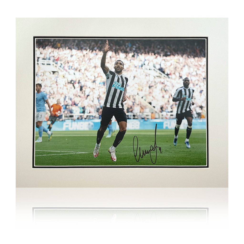A mounted photo signed by striker Callum Wilson, who joined Premier League side Newcastle United on 7th September 2020. This item was signed at an exclusive Fan Cave signing with Callum on 10/11/22. This mount is designed t...