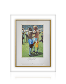A iconic moment between two greats of the game Bobby Moore and Pele from the 1970 FIFA World Cup. This has been signed by three times world cup winner and arguably one of the greatest players of all time; Pele. These mounts are designed to fit an off the shelf size frame and make a great addition to any collection.