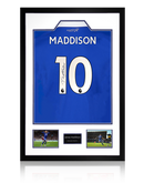 2 photo signed shirt display by James Maddison who's 20/21 season with Leicester helped the Foxes to 5th in the Premier League and to the clubs first ever FA cup win. This item was signed at an exclusive Fan Cave signing with James on 02/04/23.