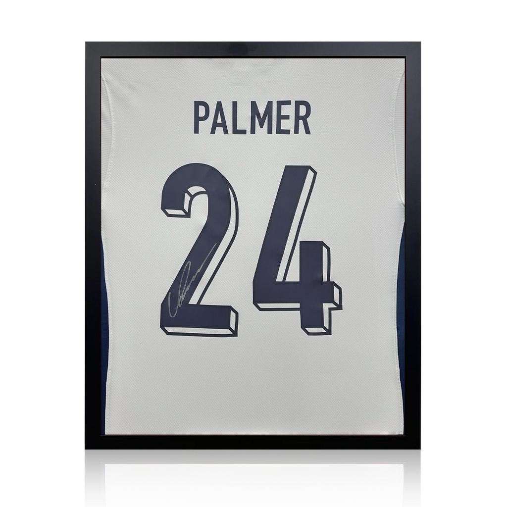 Framed shirt presentation signed by England striker Cole Palmer. This framed display contains a signed shirt. This item was signed at an exclusive Fan Cave signing with Cole Palmer on 29/08/24.