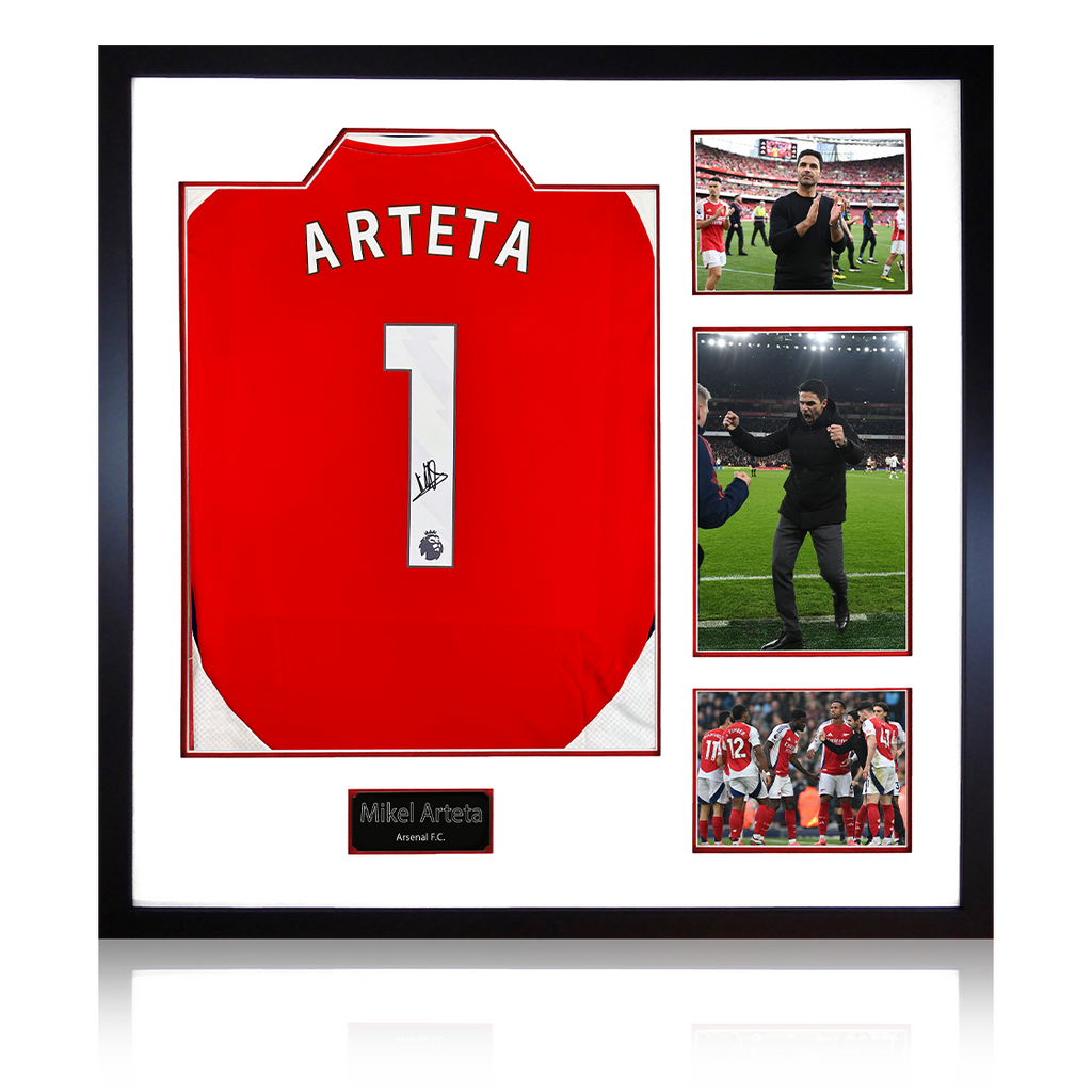 Beautifully presented Elite Frame with signed Arsenal shirt from Mikel Arteta. This item measures approximately 820mm x 820mm. This item is accompanied with an certificate of authenticity from The Fan Cave.