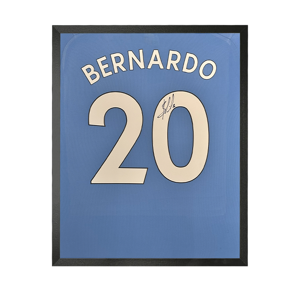 Wooden Framed signed shirt display by Bernardo Silva with fan style numbers. Since joining the The Citizens in 2017, he has won 11 domestic trophies which include 4 Premier League Titles, 1 FA Cup and 4 League Cups in a row.