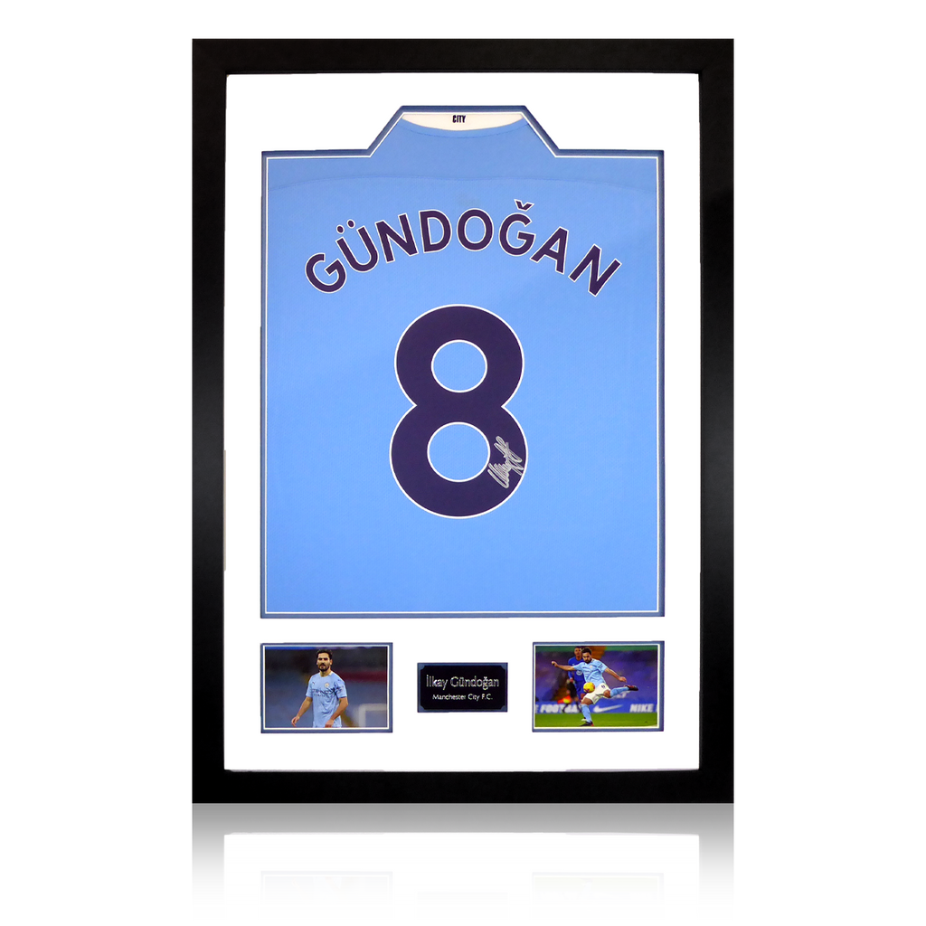 2 photo signed shirt display by Ilkay Gundogan. So far in his Manchester City career his has won 11 trophies with the club which include 4 Premier League titles, 1 FA Cup, 2 Community Shields and 4 League Cups in a row.