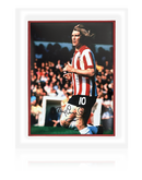 Mounted photo signed by Sheffield United legend Tony Currie. Voted as their greatest player at SUFC's 125th anniversary, TC continues to be popular with old and young fans of the club. This mount is designed to fit an off the shelf sized frame and would make a great addition to any collection.