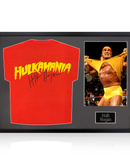 Framed official WWE "Hulkamania" T-Shirt signed by Hulk Hogan. This would make a fantastic addition to any WWE collection. This item measures approximately 750mm x 600mm. This item is accompanied with an certificate of authenticity from The Fan Cave and official JSA hologram.