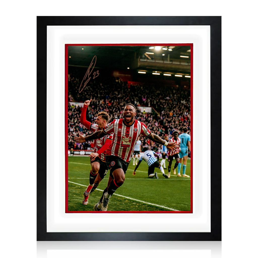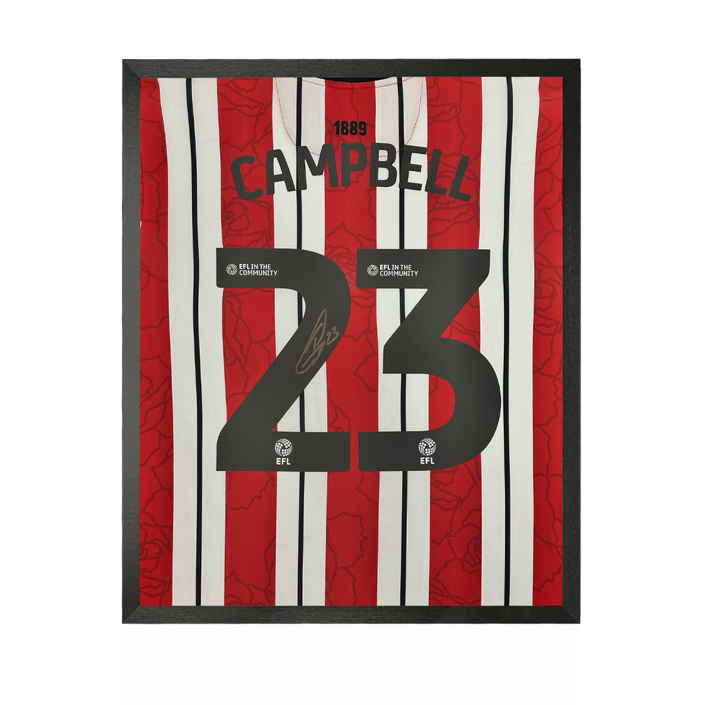 Wooden framed SUFC display containing a shirt signed by striker Tyrese Campbell. These are Sheffield United official shirts by signed at a private signing exclusively with The Fan Cave in 2025! This item comes with an The Fan C...