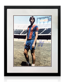 A signed 16x12 mounted image in a frame of Dutch legend Johan Cruyff. When Cruyff joined Barcelona in 1973 he helped the club win their first league title since 1960, defeating their fiercest rivals Real Madrid 5–0 at their home of the Santiago Bernabéu.