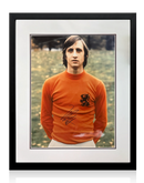 A signed 16x12 mounted image in a frame of Dutch legend Johan Cruyff. As a Dutch international, Cruyff played 48 matches, scoring 33 goals. The national team never lost a match in which Cruyff scored.