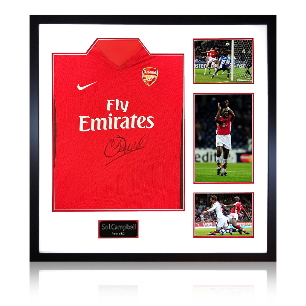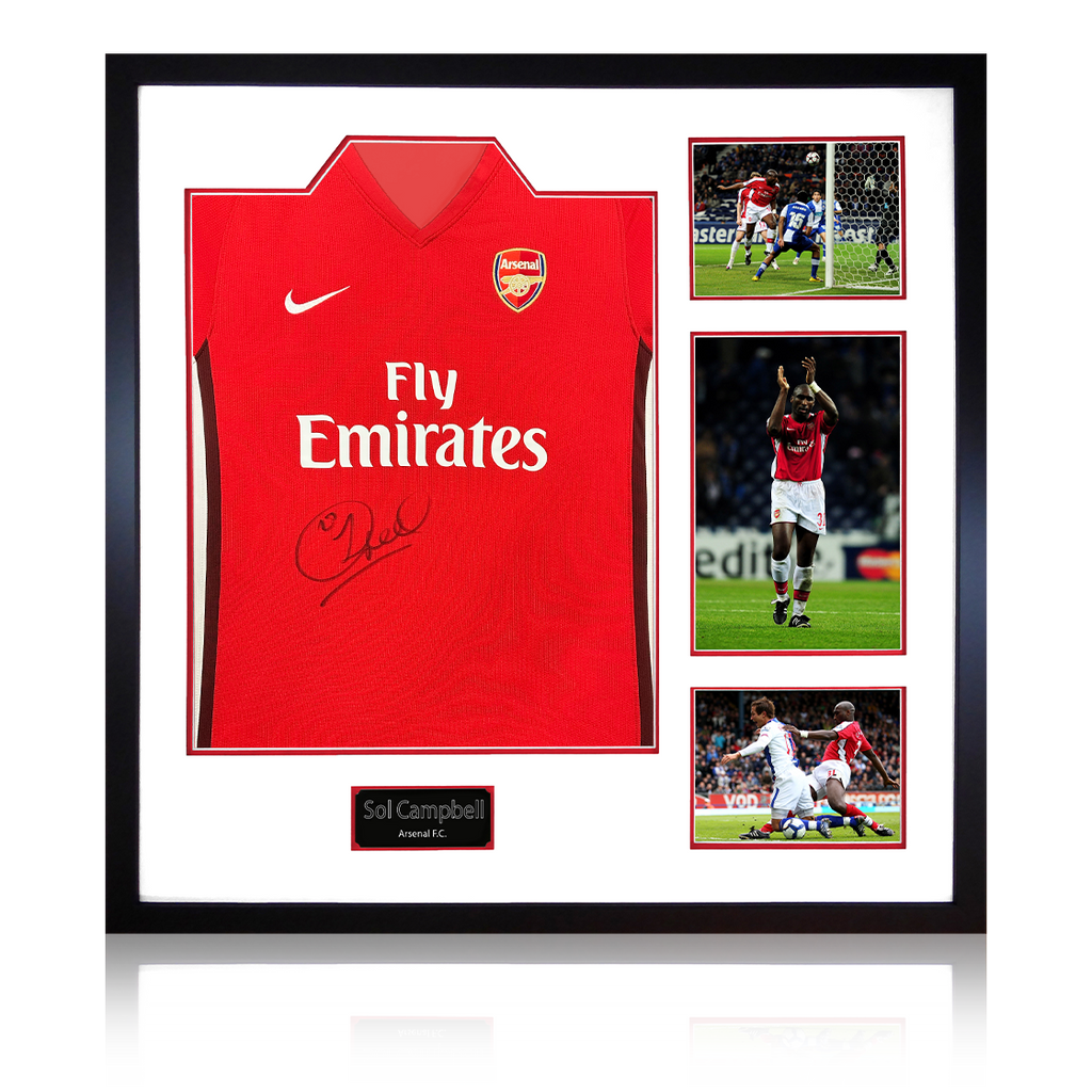 A signed authentic Arsenal 2009/10 home shirt by Sol Campbell in a Elite Frame. The item was signed at a private signing on the 06/03/25. This item is accompanied with an certificate of authenticity from The Fan Cav...