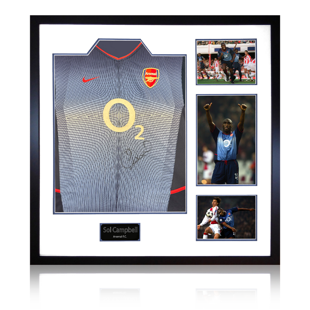 A signed Arsenal authentic 2002/04 away shirt by Sol Campbell in a Elite Frame. The item was signed at a private signing on the 06/03/25. This item is accompanied with an certificate of authenticity from The Fan Cav...