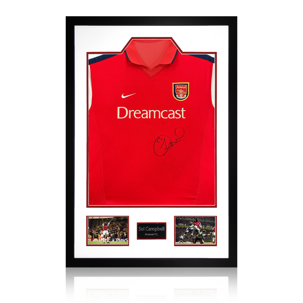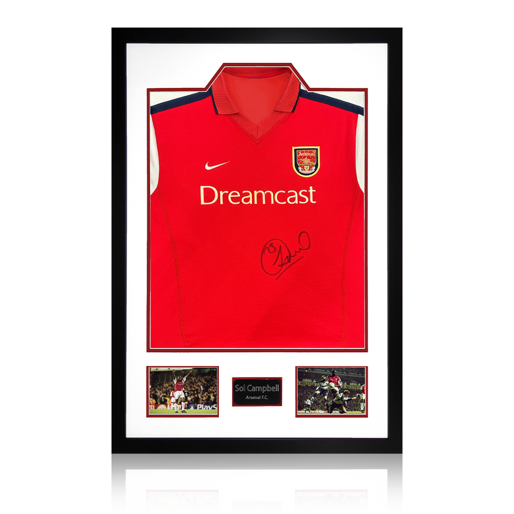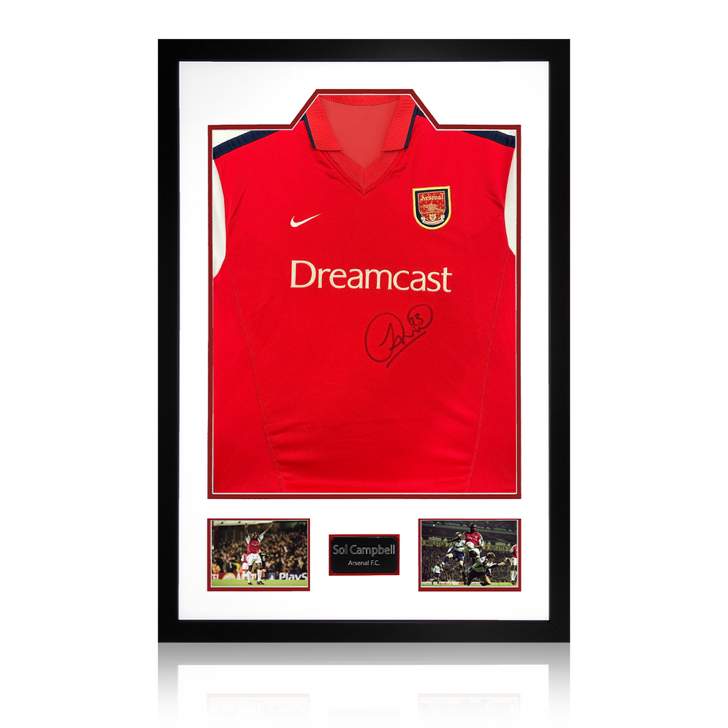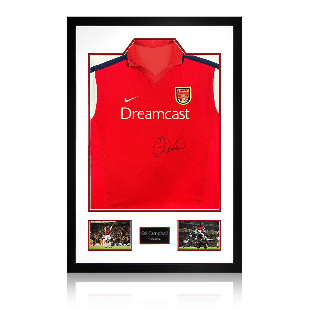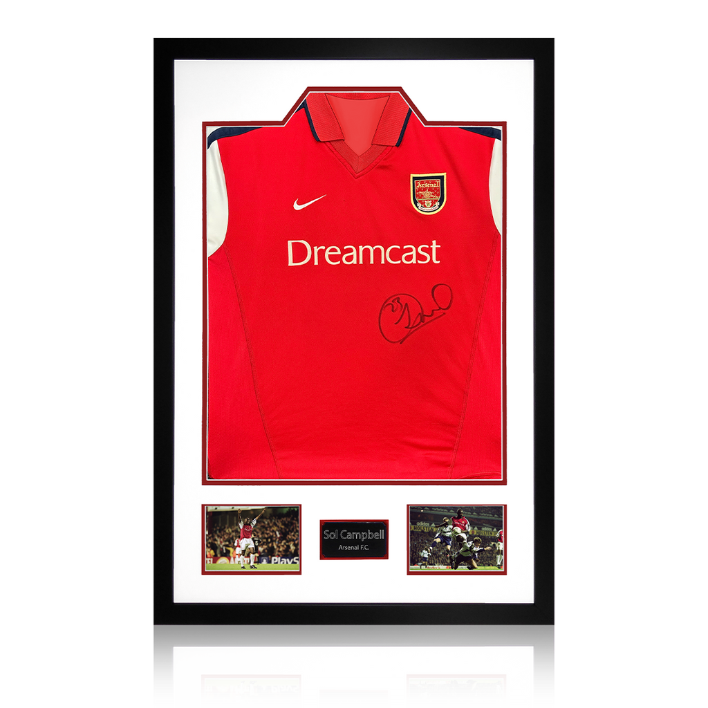 A signed authentic Arsenal 00/02 shirt by Sol Campbell in a Premium Frame. The item was signed at a private signing on the 06/03/25. This item is accompanied with an certificate of authenticity from The Fan Cave.