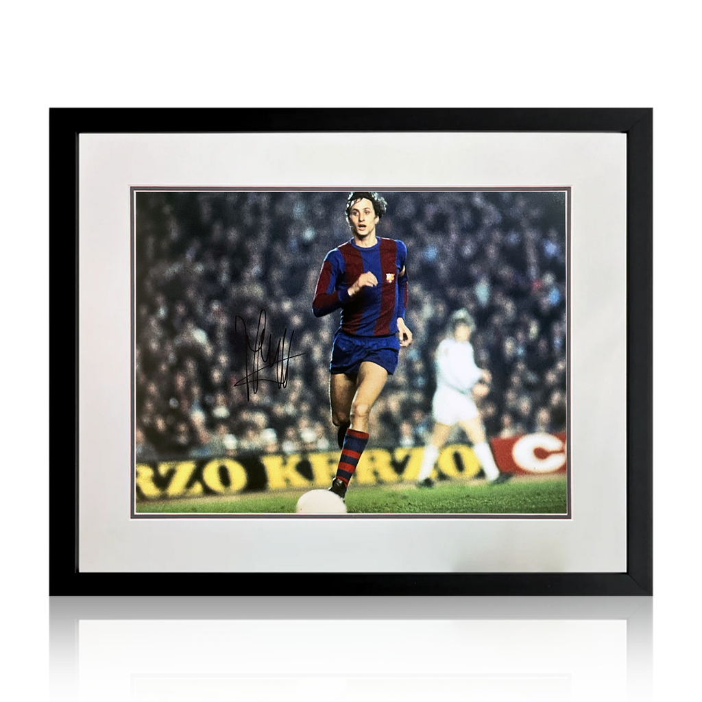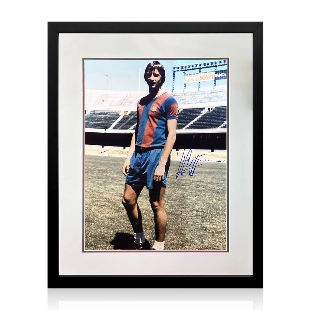 A signed 16x12 mounted image in a frame of Dutch legend Johan Cruyff. When Cruyff joined Barcelona in 1973 he helped the club win their first league title since 1960, defeating their fiercest rivals Real Madrid 5–0 at their hom...