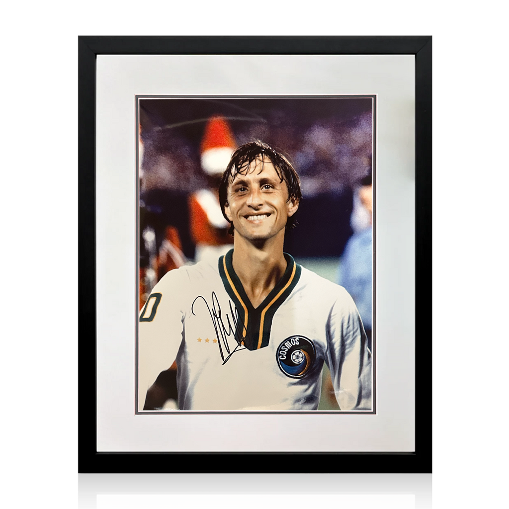 A signed 16x12 mounted image in a frame of Dutch legend Johan Cruyff. Cruyff played for New York Cosmos in exhibition games in the United States.