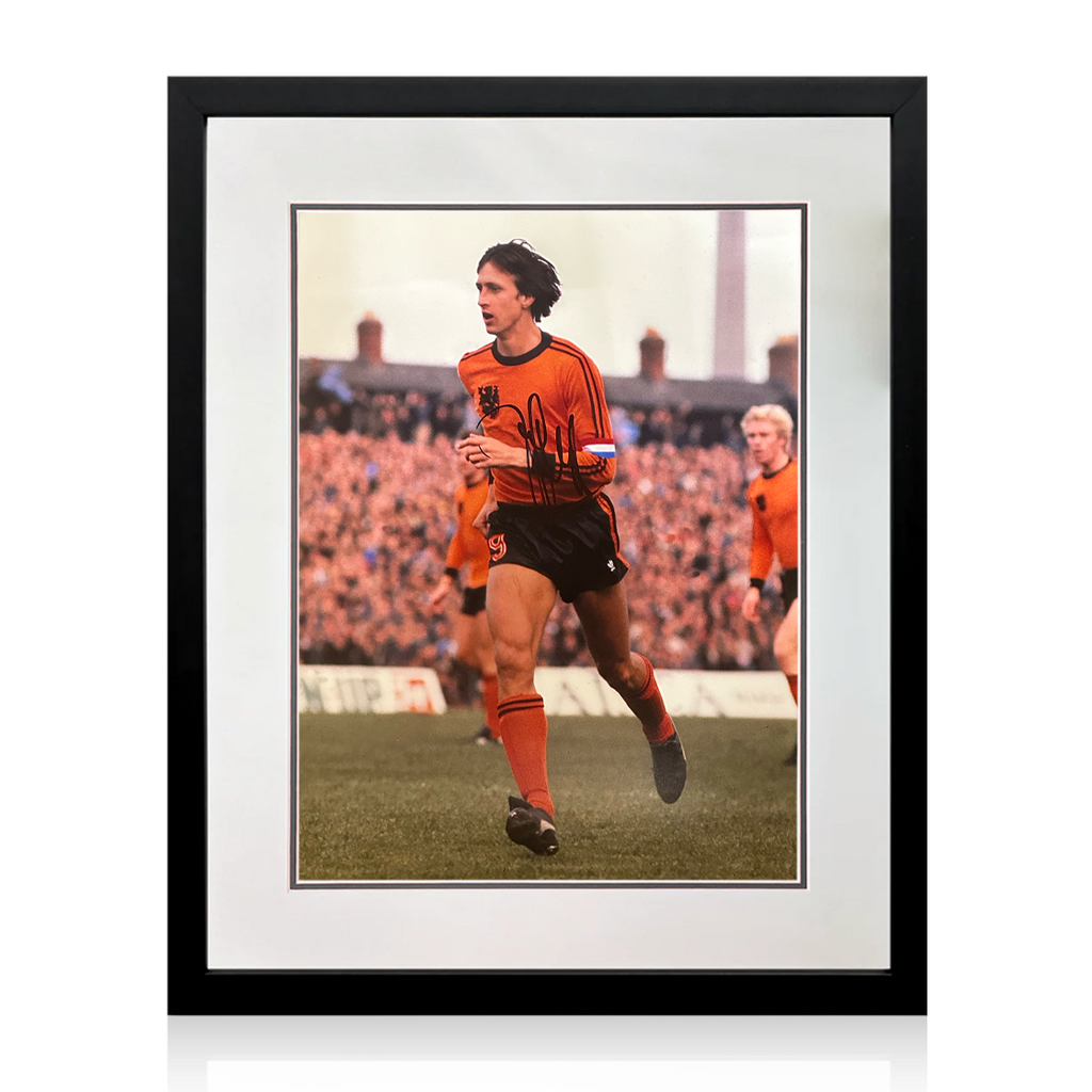 A signed 16x12 mounted image in a frame of Dutch legend Johan Cruyff. As a Dutch international, Cruyff played 48 matches, scoring 33 goals. The national team never lost a match in which Cruyff scored.