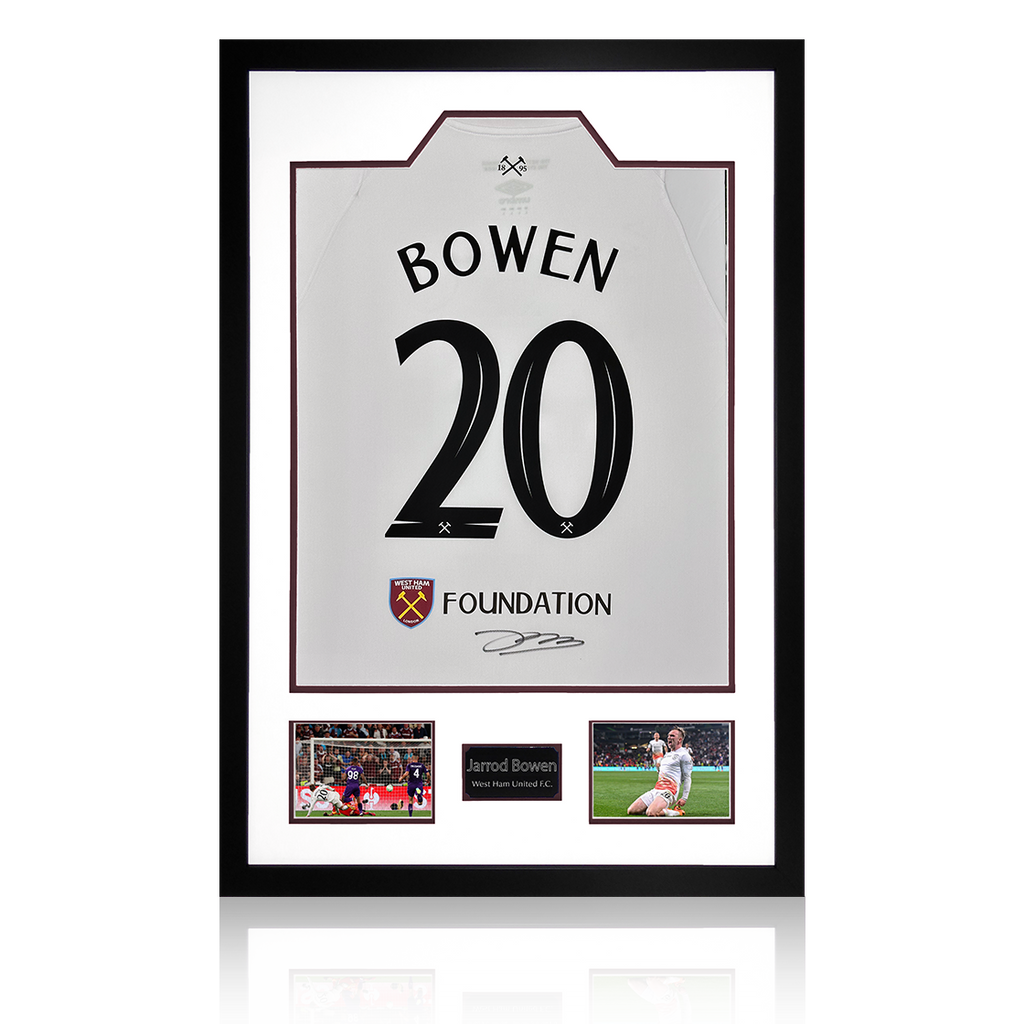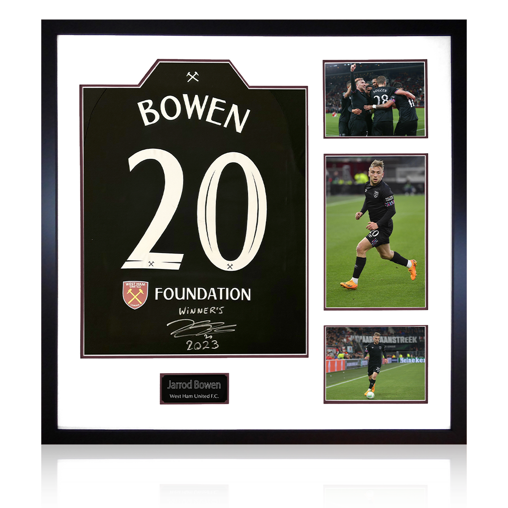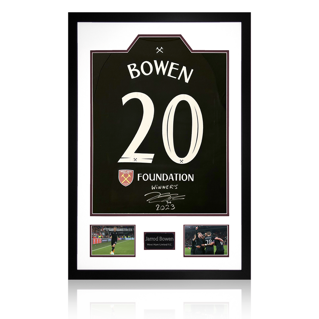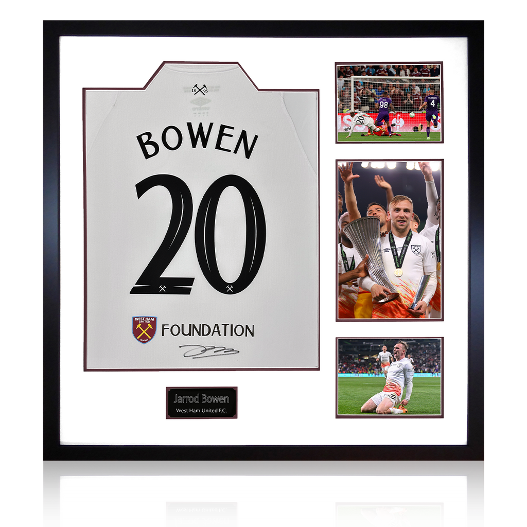 Jarrod Bowen signed West Ham United 22/23 shirt in a Premium Frame. Jarrod Bowen scored the winning goal for the hammers in the UEFA Europa Conference League 2023 final. Making West Ham the first team to lift the Europa Confere...
