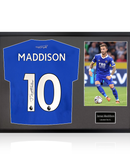 2 photo signed shirt display by James Maddison who's 20/21 season with Leicester helped the Foxes to 5th in the Premier League and to the clubs first ever FA cup win. This item was signed at an exclusive Fan Cave signing with James on 02/04/23.