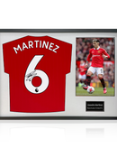 Signed shirt display in a wooden frame with photos and an etched plaque. The shirt has been signed by Argentinian defender and world cup winner; Lisandro Martínez.