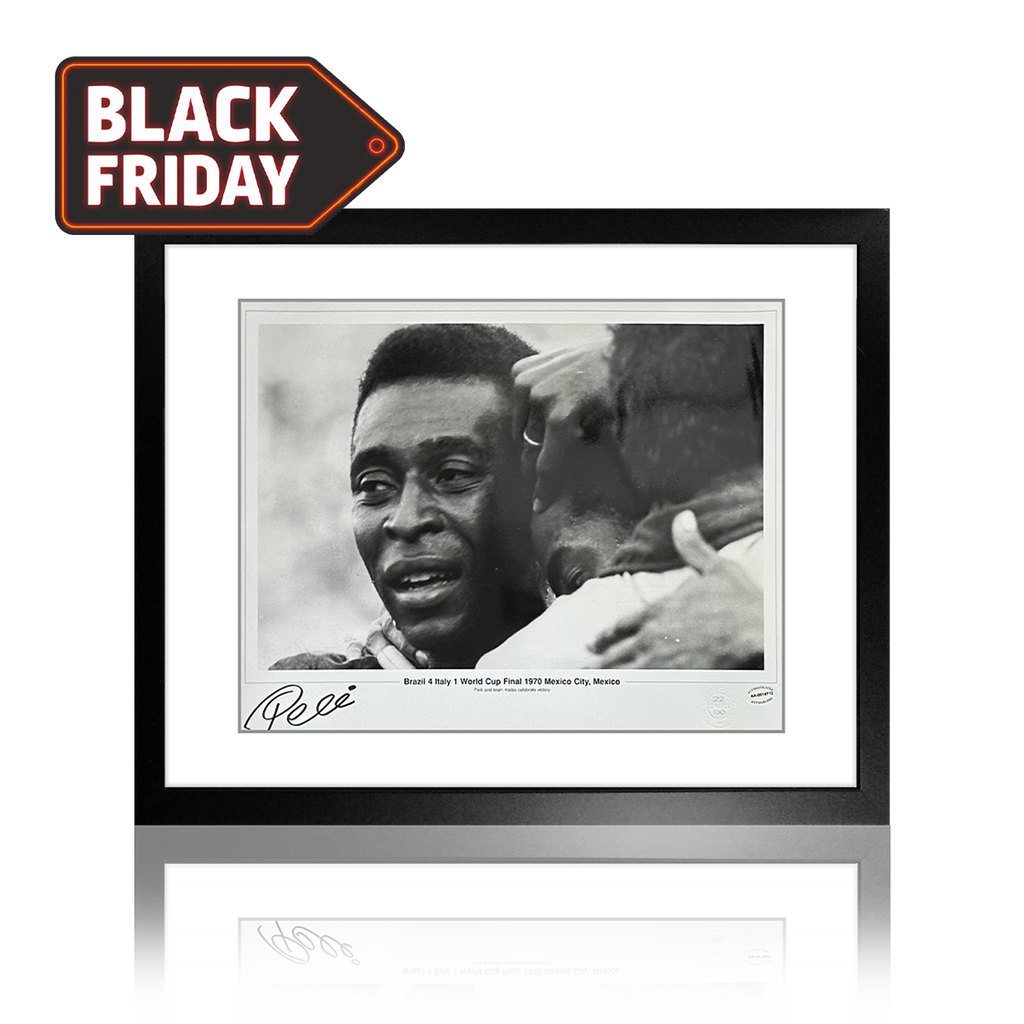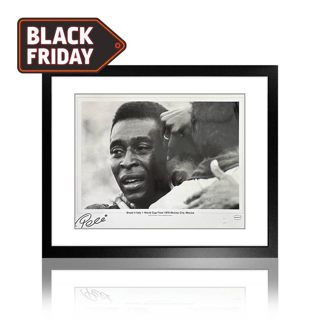One of a limited number of 100 displays from the 1970 World Cup final in Mexico. This mounted photo display in a wooden frame has been signed by Brazilian icon and football legend; Pele.