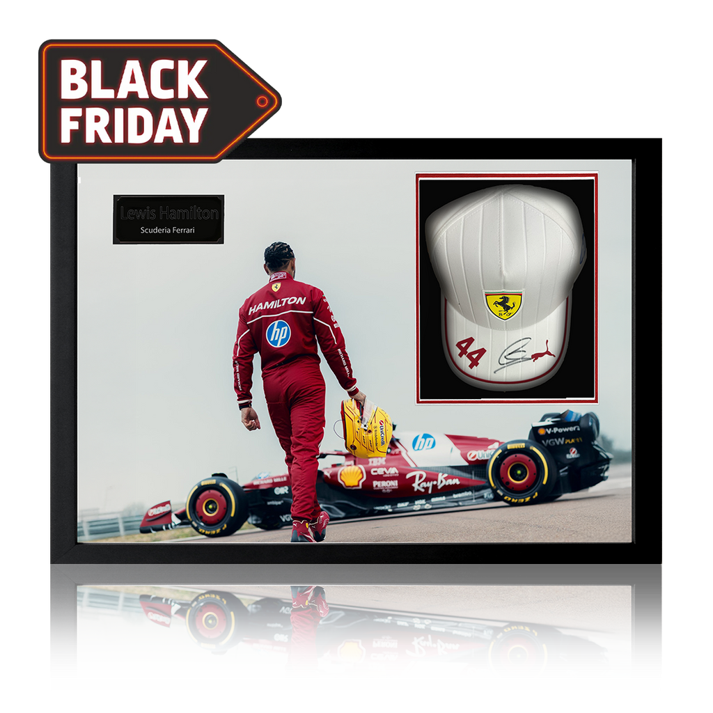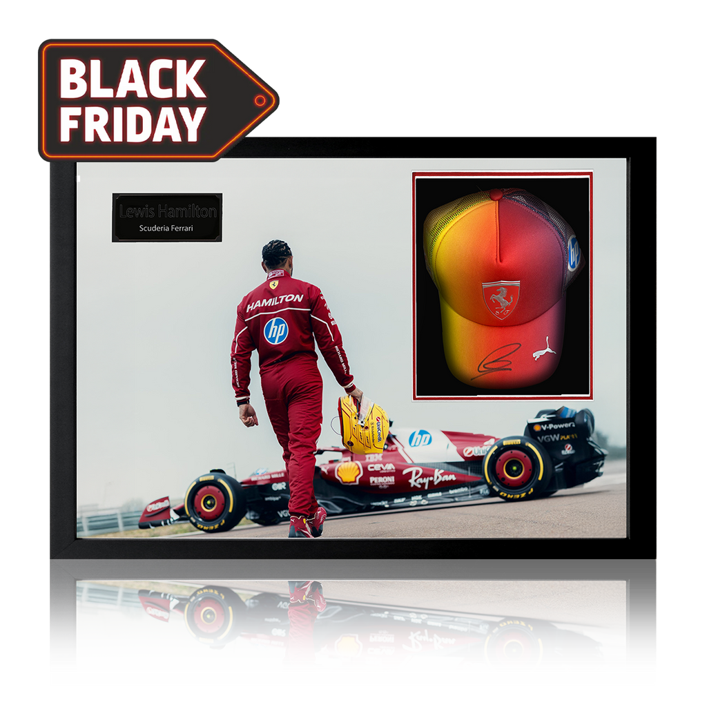 This fantastic looking display measuring approximately 690mm x 480mm contains signed Ferrari cap by Lewis Hamilton. This is presented with a plaque. This item is accompanied with an certificate of authenticity from The Fan Cave.