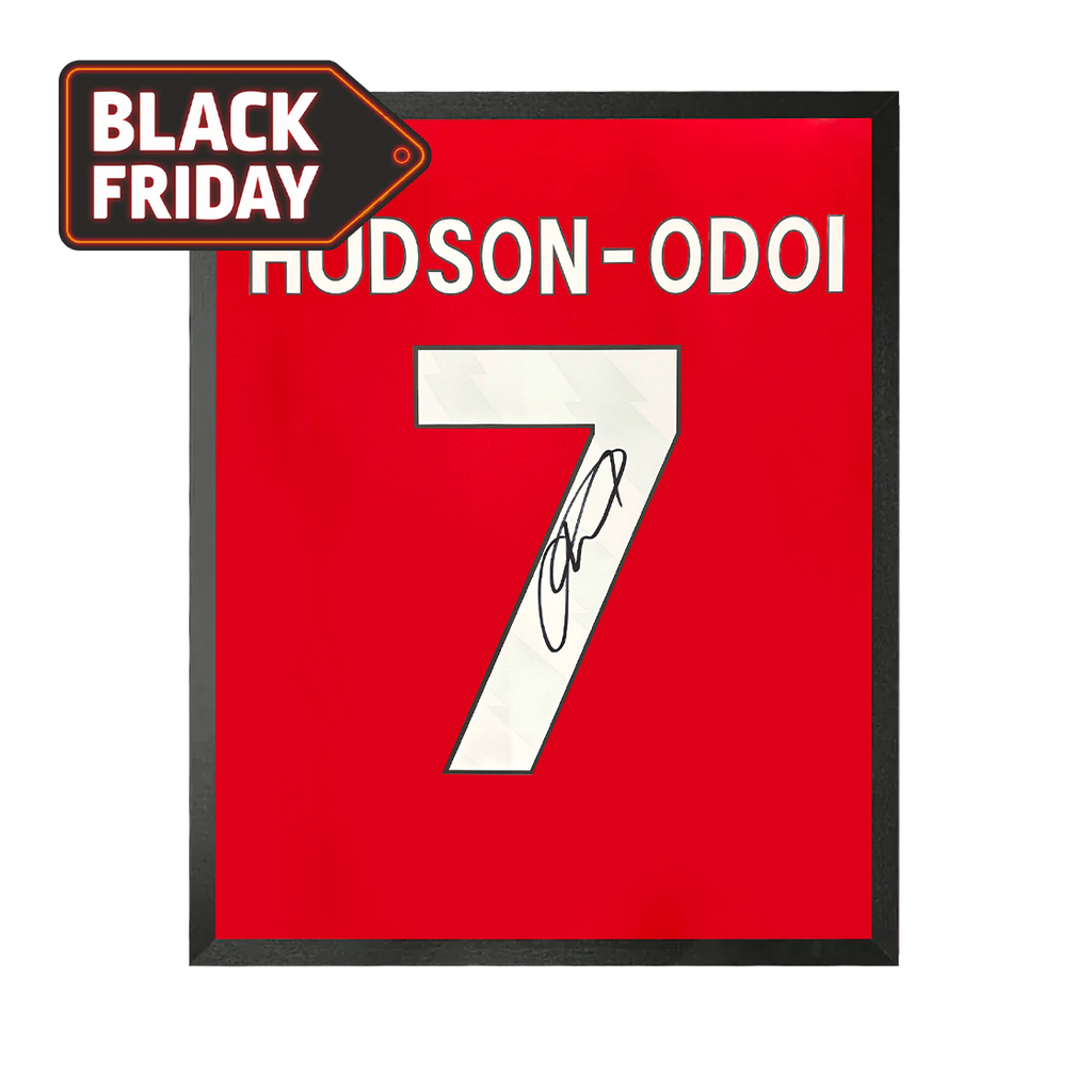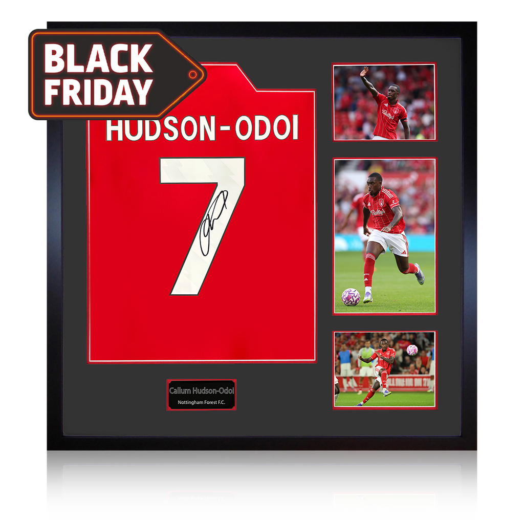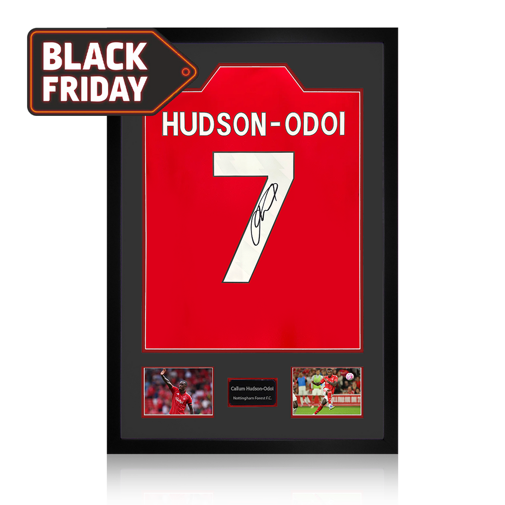 Framed signed shirt display by Nottingham Forest forward, Callum Hudson-Odoi with a custom engraved plaque, three photos & black top mount.This item measures approximately 820mm x 820mm. Signed as part of a private signing ...