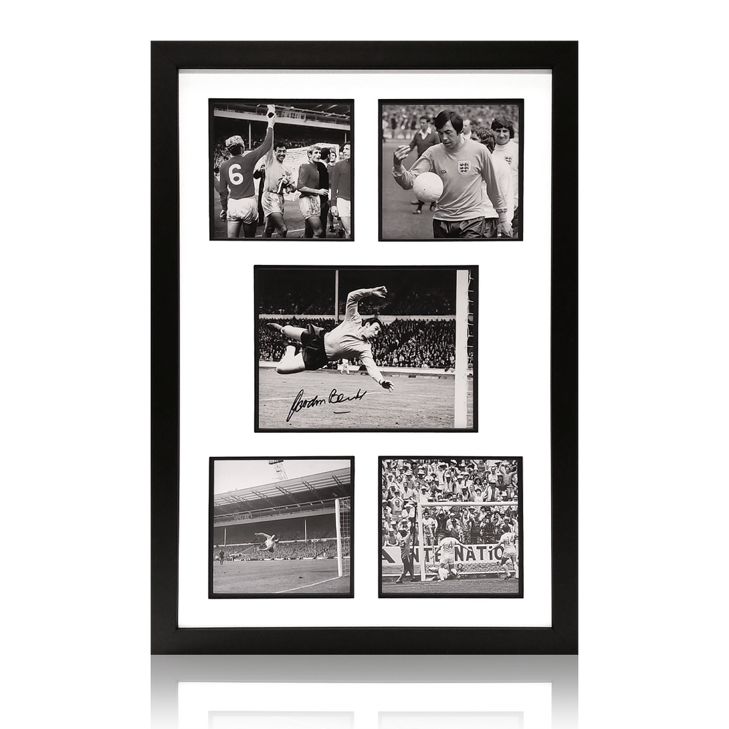 Framed mount display signed by Gordon Banks. He made 73 caps in 9 years for England where he also was in the 1966 World Cup winning side. He is also very well know for the "Greatest Save" which happened in the 1970 World Cup a...