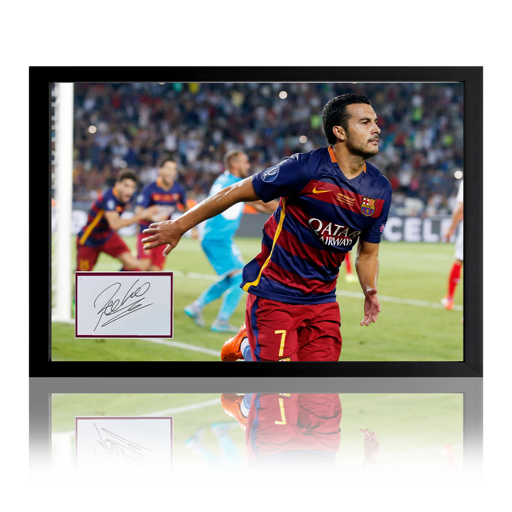 Wooden framed poster mount display containing a signed card from spanish footballer Pedro. During his time at Barcelona, Pedro scored 99 goals in 321 appearances across all competitions between 2008 and 2015. As an internationa...
