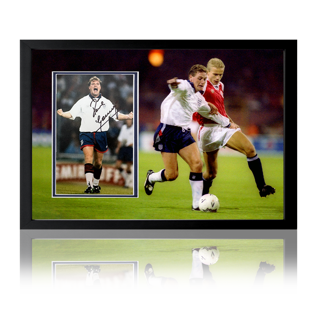 Wooden framed poster mount display containing a signed card from England midfielder Paul Gascoigne. Gascoigne was first called up to the full England squad by Bobby Robson for a friendly against Denmark on 14 September 1988, a...