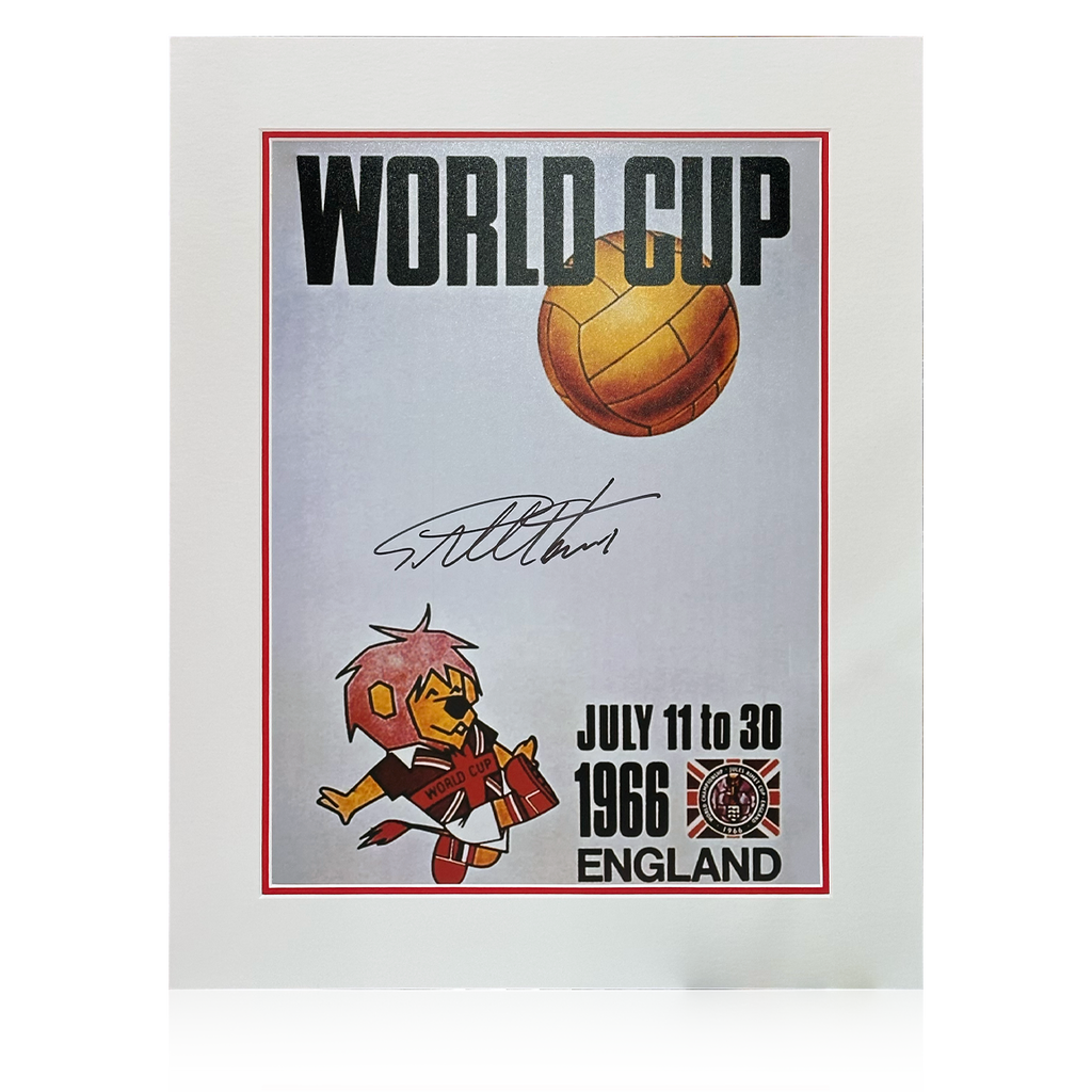 Mounted mini World Cup '66 poster. Signed by the only player to score a hat-trick in a World Cup Final and win, Sir Geoff Hurst