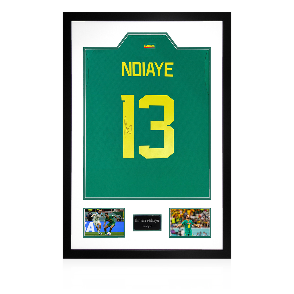 Wooden framed Senegal display containing an etched plaque, three photos and a shirt signed by striker Iliman Ndiaye. These are Senegal official shirts by signed at a private signing exclusively with The Fan Cave in 2022!