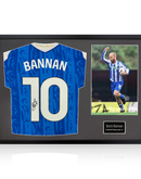Wooden framed SWFC display containing an etched plaque and a shirt signed by midfielder Barry Bannan. After joining The Owls in 2015 Bannan was made captain at the start of the 2020/2021 season and continues to be one of the sides top players. This is a pre-order item with delivery at mid February. This shirt has Fan Style Numbers.