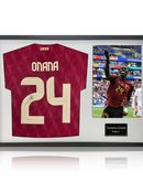 Beautifully presented Classic Frame with signed Belgium shirt from Amadou Onana. The item was signed at a private signing session with The Fan Cave on the 27/02/25. This item measures approximately 800mm x 650mm and is accompanied with an certificate of authenticity from The Fan Cave.