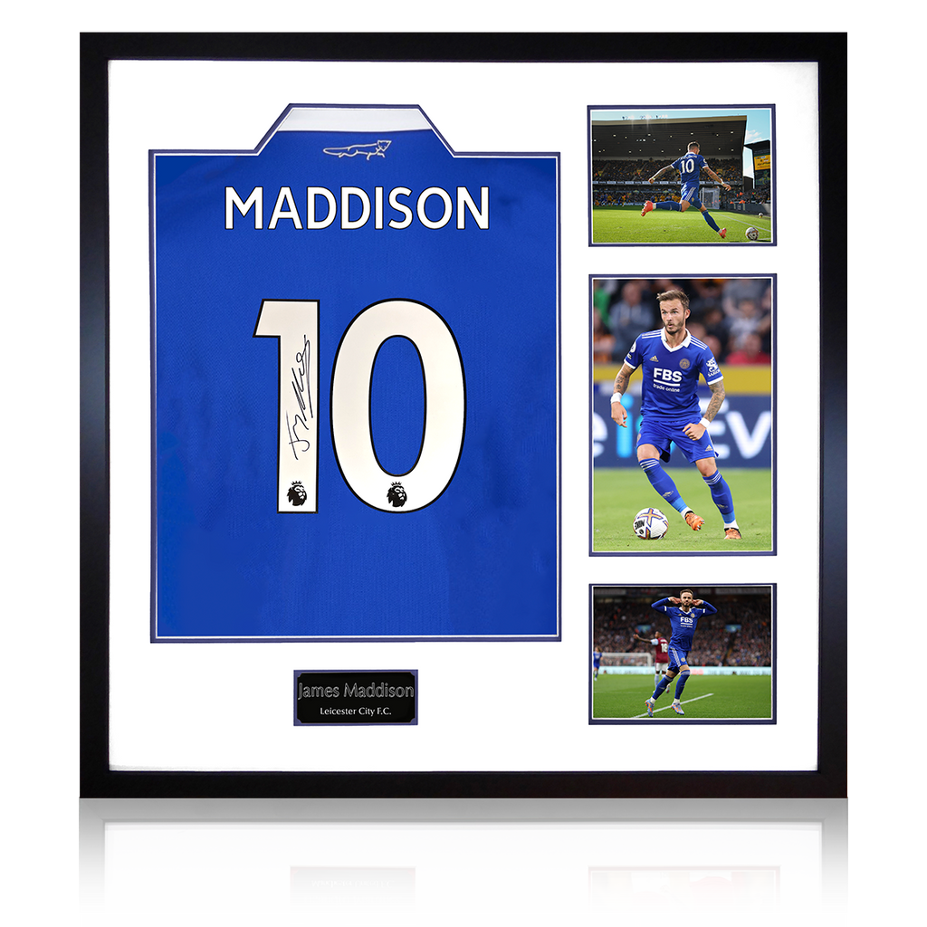 3 photo signed shirt display by James Maddison who's 20/21 season with Leicester helped the Foxes to 5th in the Premier League and to the clubs first ever FA cup win. This item was signed at an exclusive Fan Cave signing with J...