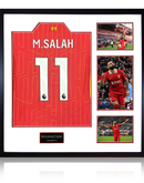 Liverpool shirt display signed by Mo Salah. This wooden framed display contains a signed shirt, etched plaque and 3 photos. This item measures approximately 820mm x 820mm. This item is accompanied with an certificate of authenticity from The Fan Cave.