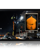 Poster mounted and framed official McLaren Racing cap signed by current Formula One world Drivers Champion; Lando Norris. This presentation of him stood on his winning F1 car with an etched plaque, would make a fantastic addition to any motorsport collection. This item measures approximately 690mm x 480mm. This item is accompanied with an certificate of authenticity from The Fan Cave. Please note signature placement may vary to the main image.